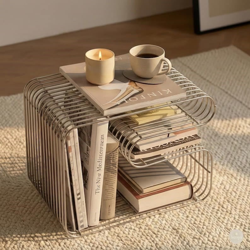 Akışkan metal çizgileri ve kompakt formuyla hem dekoratif bir obje hem de işlevsel bir sehpa olarak yaşam alanınıza eşlik eder. Kitaplarınız, dergileriniz ve kahve köşeniz için şık bir düzen sunarken minimal estetiğiyle mekâna sofistike bir hava katar.
